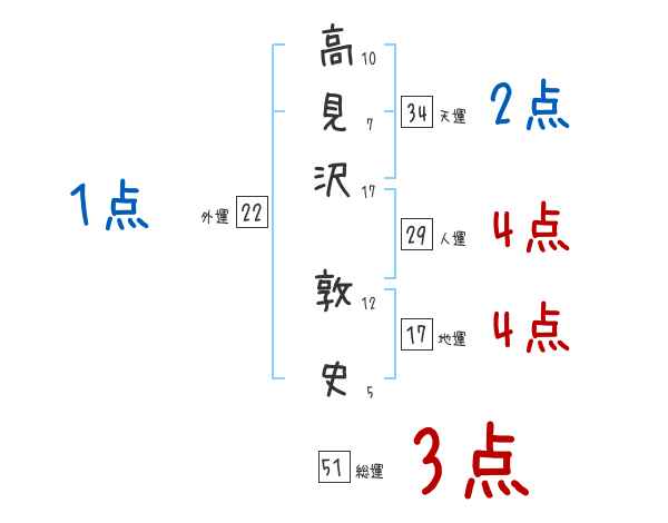 外運![]() | 高見沢敦史さんの外運は22画の1つ星!努力することが苦手ないっぽう手先が器用。芸術性にも優れる。 生活面を象徴する運勢です。外部から受ける影響力を表し、結婚運、家庭運や職場、環境への順応性を表します。 |