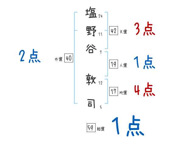 天運![]() | 塩野谷敦司さんの天運は42画の3つ星!病気に注意。多芸であるが消極的でおとなしい。 家系が持つ宿命的な運勢を表します。祖先から受け継いだ苗字ですので自分の力が及びません。家柄を象徴します。 |