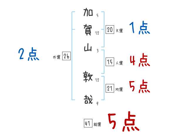 外運![]() | 加賀山敦哉さんの外運は26画の2つ星!波瀾万丈かも。信頼できる人を大事にしましょう。 生活面を象徴する運勢です。外部から受ける影響力を表し、結婚運、家庭運や職場、環境への順応性を表します。 |