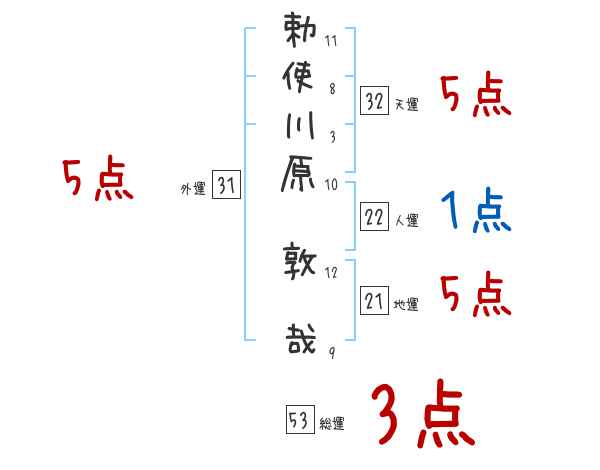天運![]() | 勅使川原敦哉さんの天運は32画の5つ星!柔軟性があり成功する。チャンスが多く金運が良い。 家系が持つ宿命的な運勢を表します。祖先から受け継いだ苗字ですので自分の力が及びません。家柄を象徴します。 |