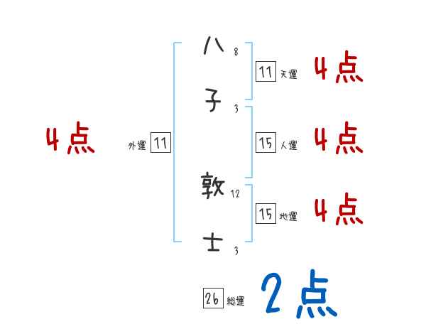 天運![]() | 八子敦士さんの天運は11画の4つ星!着実に富や地位を得る幸運な人生。 家系が持つ宿命的な運勢を表します。祖先から受け継いだ苗字ですので自分の力が及びません。家柄を象徴します。 |