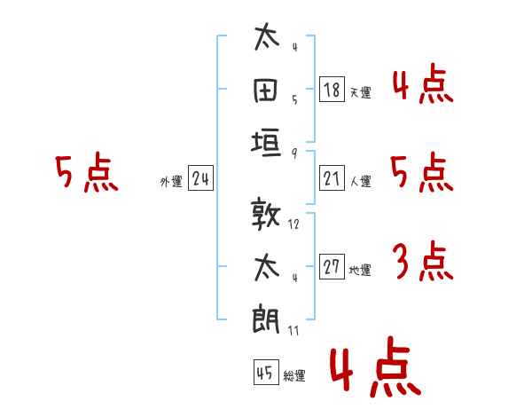 総運![]() | 太田垣敦太朗さんの総運は45画の4つ星!もくもくと物事を進め達成する。地味な努力家。 あなたの人生を表す1番重要な運勢です。生涯を通じて影響する総合運となり、主に50歳以降の晩年期に影響を及ぼします。 |