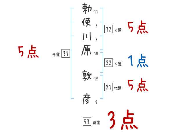 天運![]() | 勅使川原敦彦さんの天運は32画の5つ星!柔軟性があり成功する。チャンスが多く金運が良い。 家系が持つ宿命的な運勢を表します。祖先から受け継いだ苗字ですので自分の力が及びません。家柄を象徴します。 |