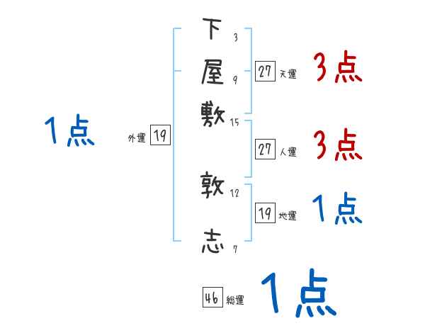 天運![]() | 下屋敷敦志さんの天運は27画の3つ星!頭脳明晰だが強情で摩擦が多い傾向。孤立に注意。 家系が持つ宿命的な運勢を表します。祖先から受け継いだ苗字ですので自分の力が及びません。家柄を象徴します。 |