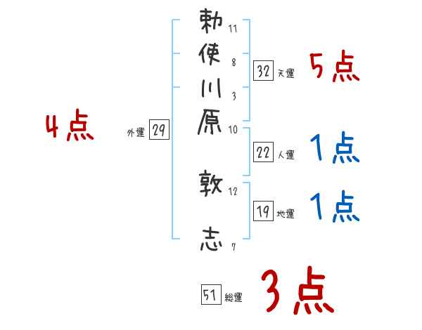 天運![]() | 勅使川原敦志さんの天運は32画の5つ星!柔軟性があり成功する。チャンスが多く金運が良い。 家系が持つ宿命的な運勢を表します。祖先から受け継いだ苗字ですので自分の力が及びません。家柄を象徴します。 |