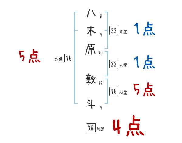 外運![]() | 八木原敦斗さんの外運は16画の5つ星!人望が厚く大きく発展する。逆転成功が見える。 生活面を象徴する運勢です。外部から受ける影響力を表し、結婚運、家庭運や職場、環境への順応性を表します。 |