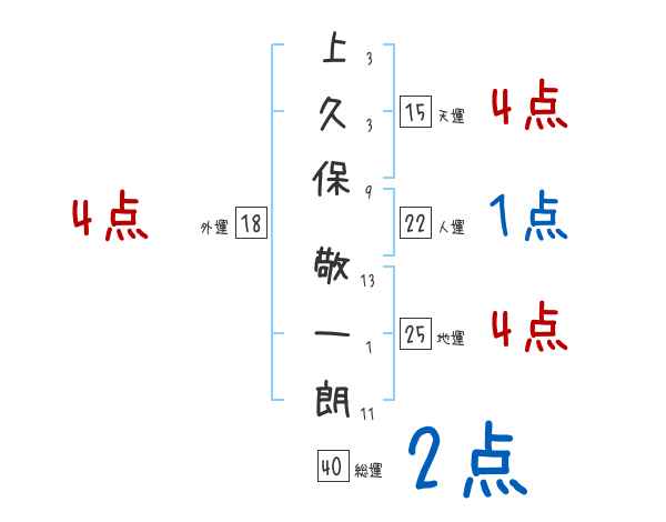 外運![]() | 上久保敬一朗さんの外運は18画の4つ星!情熱的で剛気。忍耐力があり信頼される。 生活面を象徴する運勢です。外部から受ける影響力を表し、結婚運、家庭運や職場、環境への順応性を表します。 |