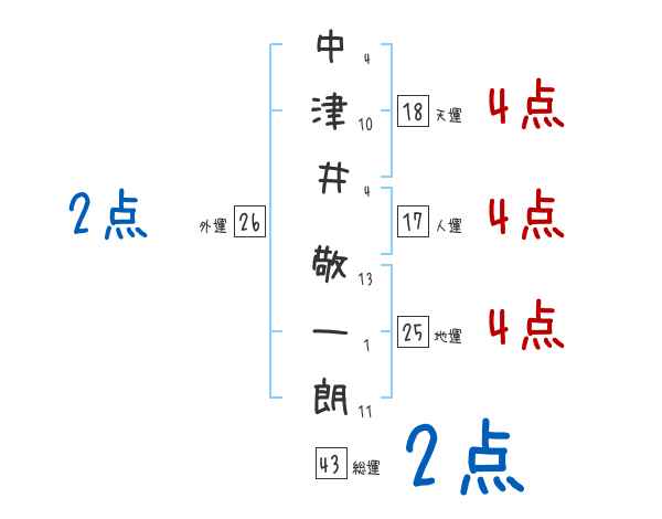 外運![]() | 中津井敬一朗さんの外運は26画の2つ星!波瀾万丈かも。信頼できる人を大事にしましょう。 生活面を象徴する運勢です。外部から受ける影響力を表し、結婚運、家庭運や職場、環境への順応性を表します。 |
