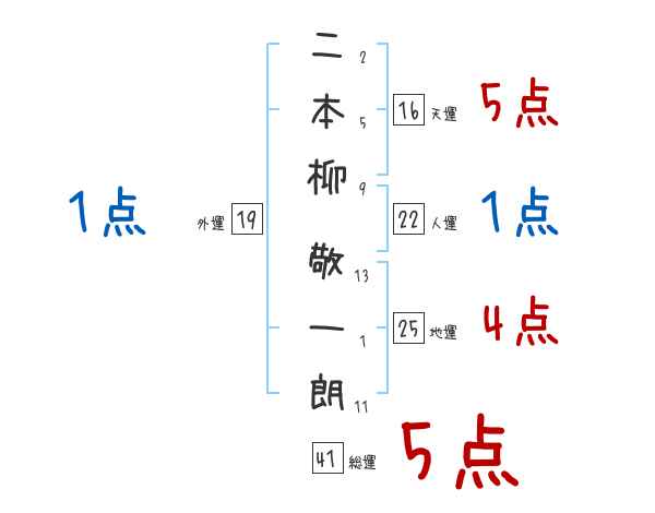 天運![]() | 二本柳敬一朗さんの天運は16画の5つ星!人望が厚く大きく発展する。逆転成功が見える。 家系が持つ宿命的な運勢を表します。祖先から受け継いだ苗字ですので自分の力が及びません。家柄を象徴します。 |