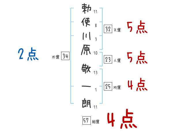 天運![]() | 勅使川原敬一朗さんの天運は32画の5つ星!柔軟性があり成功する。チャンスが多く金運が良い。 家系が持つ宿命的な運勢を表します。祖先から受け継いだ苗字ですので自分の力が及びません。家柄を象徴します。 |