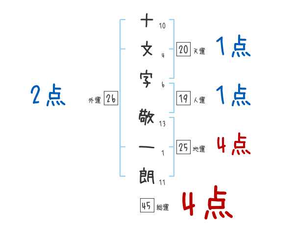 外運![]() | 十文字敬一朗さんの外運は26画の2つ星!波瀾万丈かも。信頼できる人を大事にしましょう。 生活面を象徴する運勢です。外部から受ける影響力を表し、結婚運、家庭運や職場、環境への順応性を表します。 |