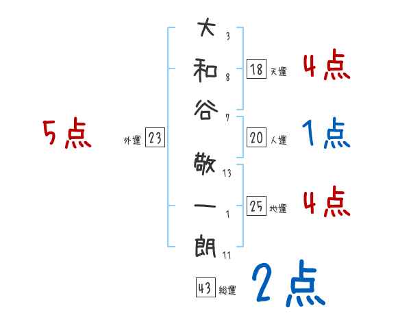 外運![]() | 大和谷敬一朗さんの外運は23画の5つ星!想像力に優れ活力がある。一代で成功し名誉を手に入れる。 生活面を象徴する運勢です。外部から受ける影響力を表し、結婚運、家庭運や職場、環境への順応性を表します。 |
