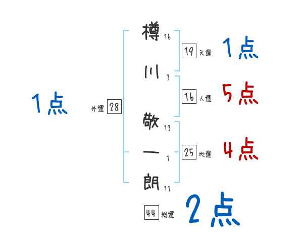 人運![]() | 樽川敬一朗さんの人運は16画の5つ星!人望が厚く大きく発展する。逆転成功が見える。 性格や才能などを表す2番目に重要な運勢です。人間関係や協調性、社会的な成功に影響します。主に20歳から50歳ぐらいまでの中年期の運勢を表します。 |