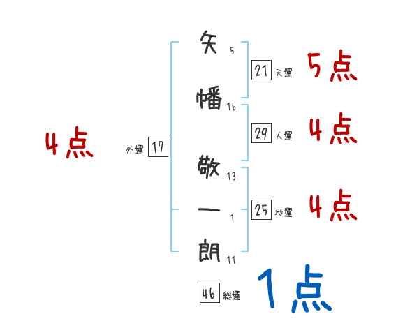 天運![]() | 矢幡敬一朗さんの天運は21画の5つ星!統率力がある。独立し成功する。名誉を手に入れる。 家系が持つ宿命的な運勢を表します。祖先から受け継いだ苗字ですので自分の力が及びません。家柄を象徴します。 |
