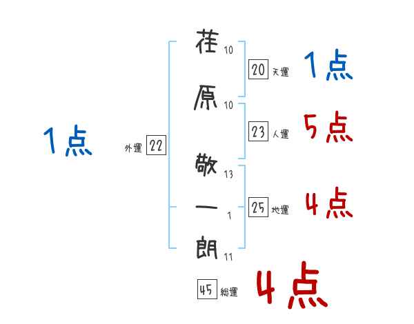 人運![]() | 荏原敬一朗さんの人運は23画の5つ星!想像力に優れ活力がある。一代で成功し名誉を手に入れる。 性格や才能などを表す2番目に重要な運勢です。人間関係や協調性、社会的な成功に影響します。主に20歳から50歳ぐらいまでの中年期の運勢を表します。 |