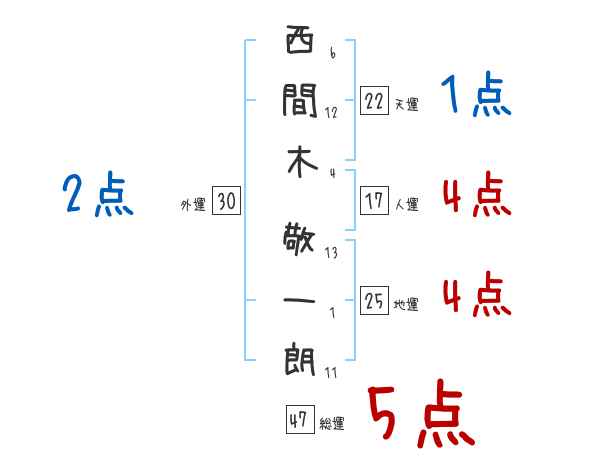 総運![]() | 西間木敬一朗さんの総運は47画の5つ星!実力が開花し発展する円満な人生。財に恵まれる。 あなたの人生を表す1番重要な運勢です。生涯を通じて影響する総合運となり、主に50歳以降の晩年期に影響を及ぼします。 |