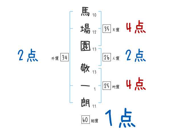 天運![]() | 馬場園敬一朗さんの天運は35画の4つ星!温厚な性格で感受性が高い。穏和な性格で人望が厚い。 家系が持つ宿命的な運勢を表します。祖先から受け継いだ苗字ですので自分の力が及びません。家柄を象徴します。 |