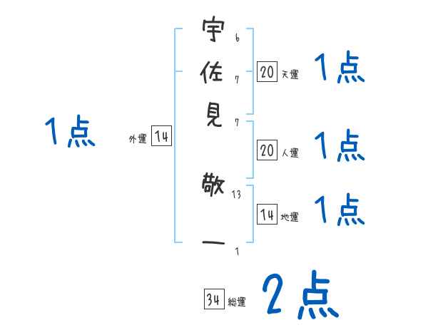 総運![]() | 宇佐見敬一さんの総運は34画の2つ星!独創性に優れるが、自尊心が強く災難に注意しましょう。 あなたの人生を表す1番重要な運勢です。生涯を通じて影響する総合運となり、主に50歳以降の晩年期に影響を及ぼします。 |