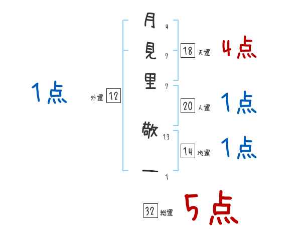 天運![]() | 月見里敬一さんの天運は18画の4つ星!情熱的で剛気。忍耐力があり信頼される。 家系が持つ宿命的な運勢を表します。祖先から受け継いだ苗字ですので自分の力が及びません。家柄を象徴します。 |