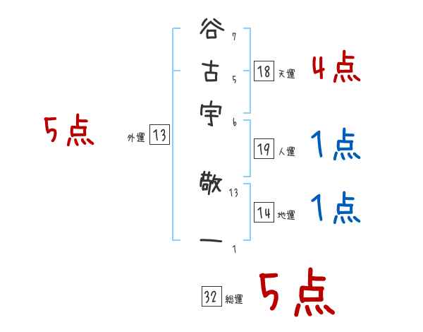 総運![]() | 谷古宇敬一さんの総運は32画の5つ星!柔軟性があり成功する。チャンスが多く金運が良い。 あなたの人生を表す1番重要な運勢です。生涯を通じて影響する総合運となり、主に50歳以降の晩年期に影響を及ぼします。 |