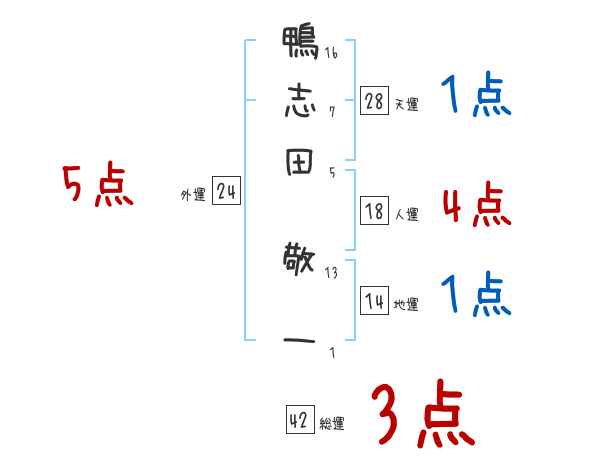天運![]() | 鴨志田敬一さんの天運は28画の1つ星!家庭環境に注意。スポーツで活躍できる能力があるかも。 家系が持つ宿命的な運勢を表します。祖先から受け継いだ苗字ですので自分の力が及びません。家柄を象徴します。 |