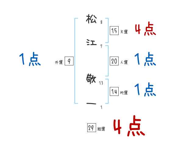 総運![]() | 松江敬一さんの総運は29画の4つ星!完全主義で才能がある。厳格な心の持ち主。 あなたの人生を表す1番重要な運勢です。生涯を通じて影響する総合運となり、主に50歳以降の晩年期に影響を及ぼします。 |