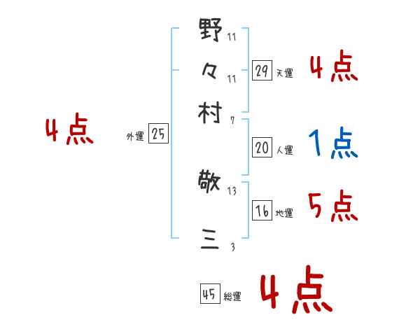 天運![]() | 野々村敬三さんの天運は29画の4つ星!完全主義で才能がある。厳格な心の持ち主。 家系が持つ宿命的な運勢を表します。祖先から受け継いだ苗字ですので自分の力が及びません。家柄を象徴します。 |