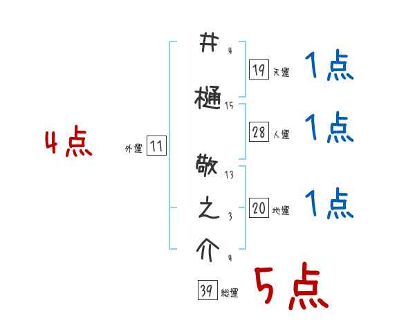 総運![]() | 井樋敬之介さんの総運は39画の5つ星!社交性に優れ人望が厚い。人の上に立ち成功する。 あなたの人生を表す1番重要な運勢です。生涯を通じて影響する総合運となり、主に50歳以降の晩年期に影響を及ぼします。 |