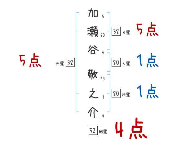 外運![]() | 加瀬谷敬之介さんの外運は32画の5つ星!柔軟性があり成功する。チャンスが多く金運が良い。 生活面を象徴する運勢です。外部から受ける影響力を表し、結婚運、家庭運や職場、環境への順応性を表します。 |