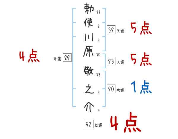 天運![]() | 勅使川原敬之介さんの天運は32画の5つ星!柔軟性があり成功する。チャンスが多く金運が良い。 家系が持つ宿命的な運勢を表します。祖先から受け継いだ苗字ですので自分の力が及びません。家柄を象徴します。 |