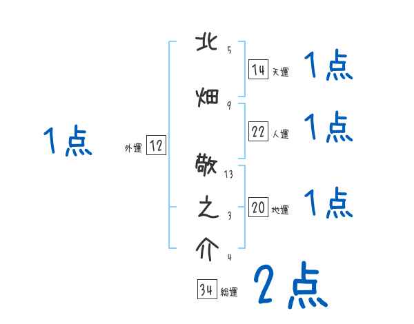総運![]() | 北畑敬之介さんの総運は34画の2つ星!独創性に優れるが、自尊心が強く災難に注意しましょう。 あなたの人生を表す1番重要な運勢です。生涯を通じて影響する総合運となり、主に50歳以降の晩年期に影響を及ぼします。 |