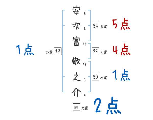 総運![]() | 安次富敬之介さんの総運は44画の2つ星!誠実で慎重な性格。物事を考えすぎないように注意しましょう。 あなたの人生を表す1番重要な運勢です。生涯を通じて影響する総合運となり、主に50歳以降の晩年期に影響を及ぼします。 |