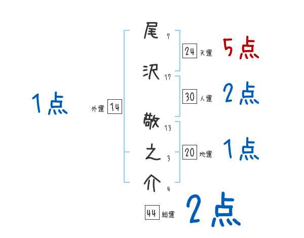天運![]() | 尾沢敬之介さんの天運は24画の5つ星!家庭運が良く順調な人生。金運にも恵まれる。 家系が持つ宿命的な運勢を表します。祖先から受け継いだ苗字ですので自分の力が及びません。家柄を象徴します。 |