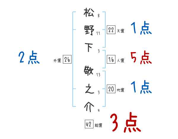 天運![]() | 松野下敬之介さんの天運は22画の1つ星!努力することが苦手ないっぽう手先が器用。芸術性にも優れる。 家系が持つ宿命的な運勢を表します。祖先から受け継いだ苗字ですので自分の力が及びません。家柄を象徴します。 |