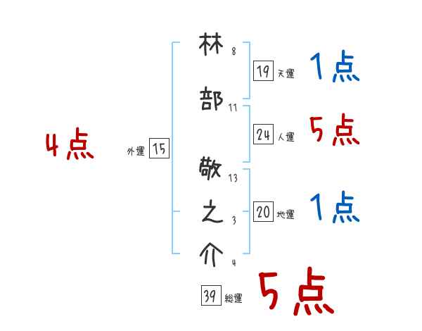 総運![]() | 林部敬之介さんの総運は39画の5つ星!社交性に優れ人望が厚い。人の上に立ち成功する。 あなたの人生を表す1番重要な運勢です。生涯を通じて影響する総合運となり、主に50歳以降の晩年期に影響を及ぼします。 |