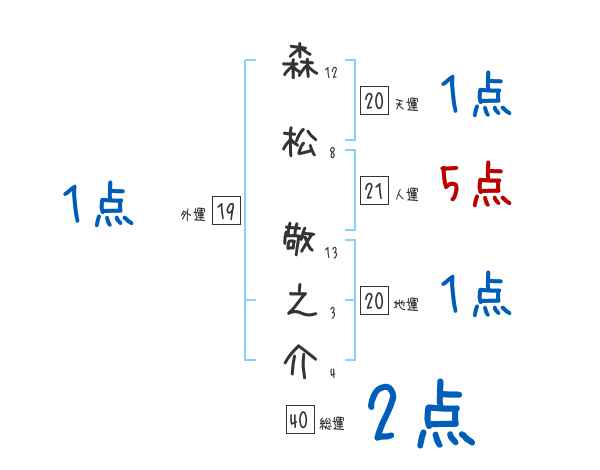 外運![]() | 森松敬之介さんの外運は19画の1つ星!優れた才能を持ちますが、協調性が足りないことも。周りの人と協力する事を意識しましょう。 生活面を象徴する運勢です。外部から受ける影響力を表し、結婚運、家庭運や職場、環境への順応性を表します。 |