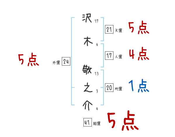 総運![]() | 沢木敬之介さんの総運は41画の5つ星!大志を抱き、目標に向かって実力を発揮し達成する。温和な性格。 あなたの人生を表す1番重要な運勢です。生涯を通じて影響する総合運となり、主に50歳以降の晩年期に影響を及ぼします。 |