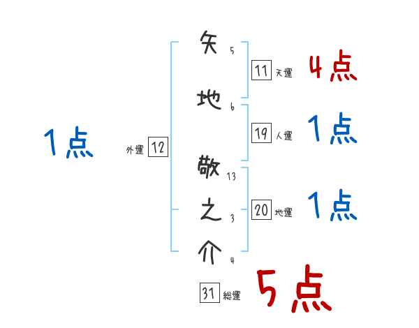 天運![]() | 矢地敬之介さんの天運は11画の4つ星!着実に富や地位を得る幸運な人生。 家系が持つ宿命的な運勢を表します。祖先から受け継いだ苗字ですので自分の力が及びません。家柄を象徴します。 |