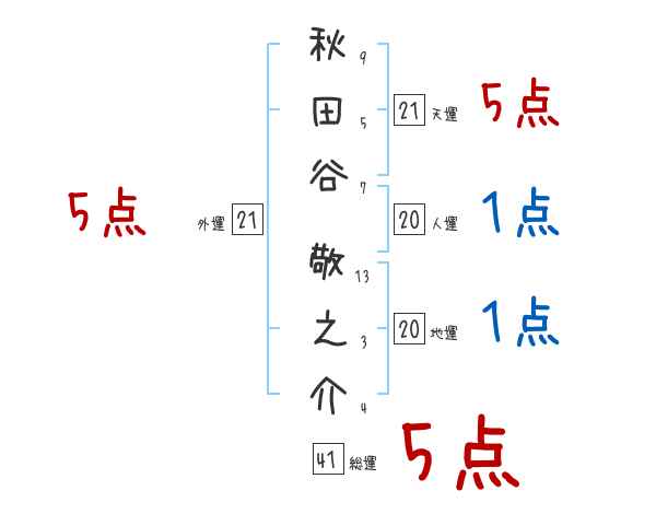 外運![]() | 秋田谷敬之介さんの外運は21画の5つ星!統率力がある。独立し成功する。名誉を手に入れる。 生活面を象徴する運勢です。外部から受ける影響力を表し、結婚運、家庭運や職場、環境への順応性を表します。 |