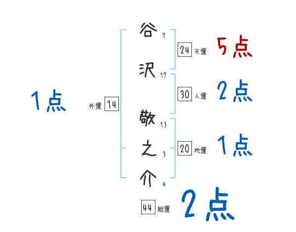 総運![]() | 谷沢敬之介さんの総運は44画の2つ星!誠実で慎重な性格。物事を考えすぎないように注意しましょう。 あなたの人生を表す1番重要な運勢です。生涯を通じて影響する総合運となり、主に50歳以降の晩年期に影響を及ぼします。 |
