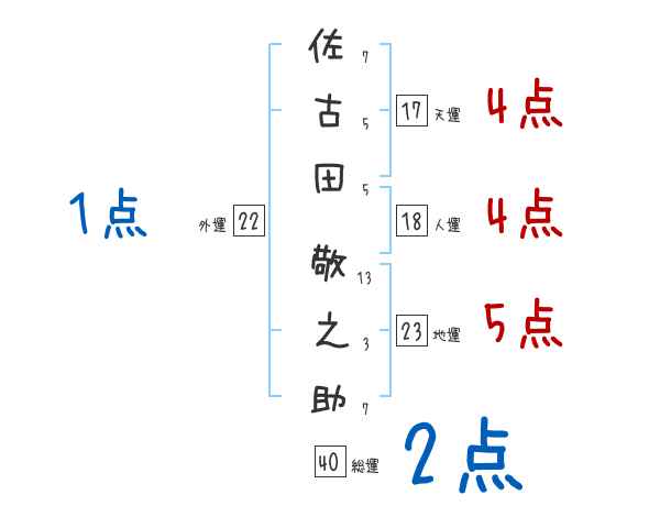 天運![]() | 佐古田敬之助さんの天運は17画の4つ星!積極的な行動力。地位を気づき財産を手に入れる。純粋な心と直感力。 家系が持つ宿命的な運勢を表します。祖先から受け継いだ苗字ですので自分の力が及びません。家柄を象徴します。 |
