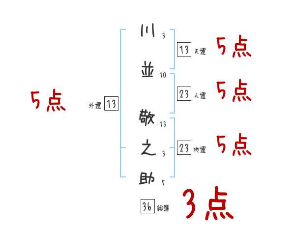 総運![]() | 川並敬之助さんの総運は36画の3つ星!先見性が豊かです。多少神経質で苦労することも。 あなたの人生を表す1番重要な運勢です。生涯を通じて影響する総合運となり、主に50歳以降の晩年期に影響を及ぼします。 |