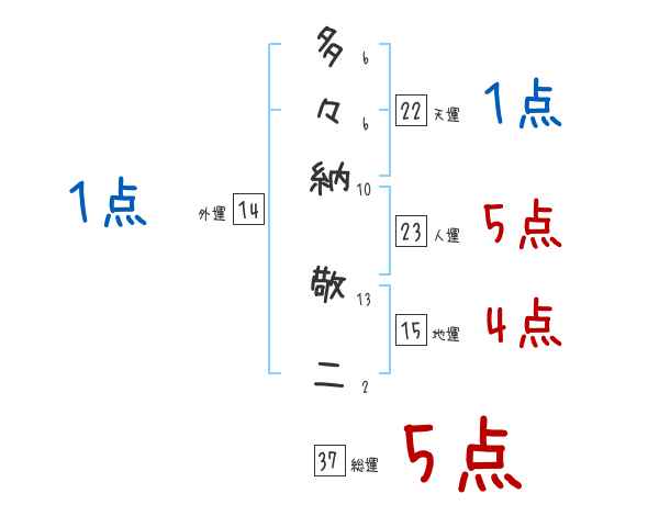 人運![]() | 多々納敬二さんの人運は23画の5つ星!想像力に優れ活力がある。一代で成功し名誉を手に入れる。 性格や才能などを表す2番目に重要な運勢です。人間関係や協調性、社会的な成功に影響します。主に20歳から50歳ぐらいまでの中年期の運勢を表します。 |