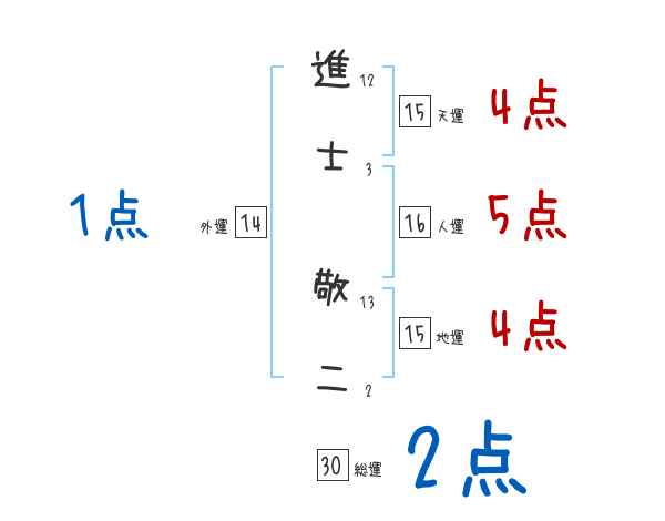 人運![]() | 進士敬二さんの人運は16画の5つ星!人望が厚く大きく発展する。逆転成功が見える。 性格や才能などを表す2番目に重要な運勢です。人間関係や協調性、社会的な成功に影響します。主に20歳から50歳ぐらいまでの中年期の運勢を表します。 |