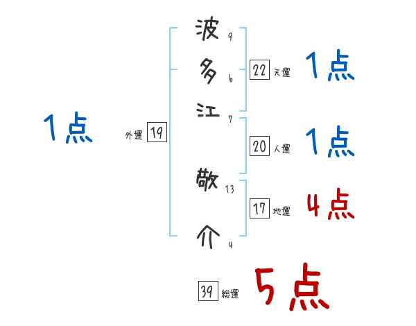 総運![]() | 波多江敬介さんの総運は39画の5つ星!社交性に優れ人望が厚い。人の上に立ち成功する。 あなたの人生を表す1番重要な運勢です。生涯を通じて影響する総合運となり、主に50歳以降の晩年期に影響を及ぼします。 |