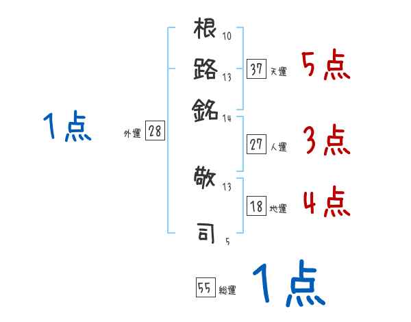 天運![]() | 根路銘敬司さんの天運は37画の5つ星!努力家で順応性に優れる。現実的な考え方ができ忠実に物事をこなす。 家系が持つ宿命的な運勢を表します。祖先から受け継いだ苗字ですので自分の力が及びません。家柄を象徴します。 |