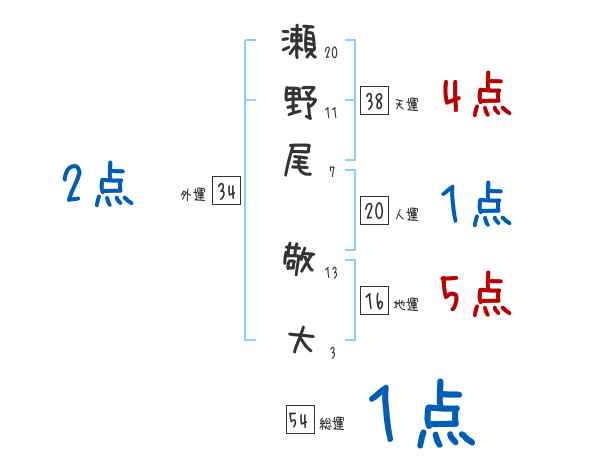 総運![]() | 瀬野尾敬大さんの総運は54画の1つ星!トラブルが多いかも。周りをよく見て協調して過ごしましょう。 あなたの人生を表す1番重要な運勢です。生涯を通じて影響する総合運となり、主に50歳以降の晩年期に影響を及ぼします。 |