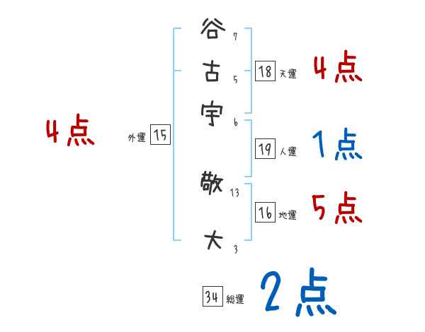 総運![]() | 谷古宇敬大さんの総運は34画の2つ星!独創性に優れるが、自尊心が強く災難に注意しましょう。 あなたの人生を表す1番重要な運勢です。生涯を通じて影響する総合運となり、主に50歳以降の晩年期に影響を及ぼします。 |