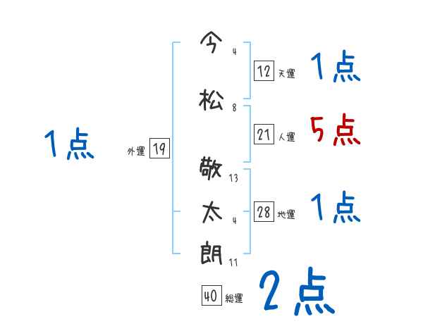 外運![]() | 今松敬太朗さんの外運は19画の1つ星!優れた才能を持ちますが、協調性が足りないことも。周りの人と協力する事を意識しましょう。 生活面を象徴する運勢です。外部から受ける影響力を表し、結婚運、家庭運や職場、環境への順応性を表します。 |