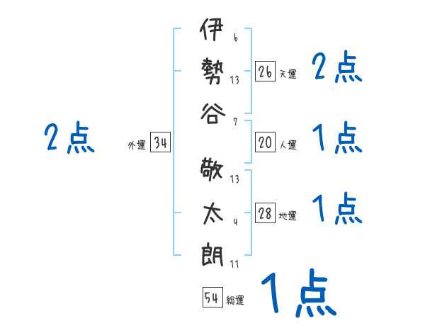 天運![]() | 伊勢谷敬太朗さんの天運は26画の2つ星!波瀾万丈かも。信頼できる人を大事にしましょう。 家系が持つ宿命的な運勢を表します。祖先から受け継いだ苗字ですので自分の力が及びません。家柄を象徴します。 |